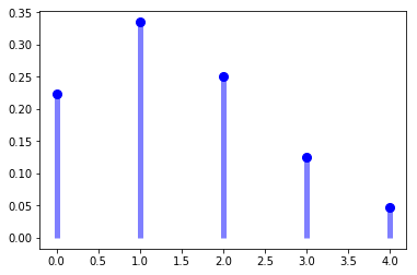 ax.vlines(x, 0, poisson.pmf(x, mu), colors='b', lw=5, alpha=0.5)